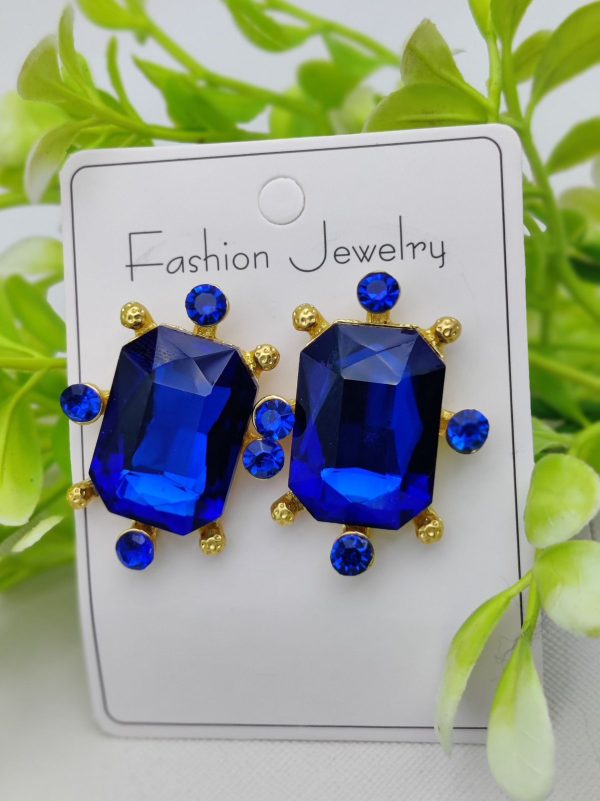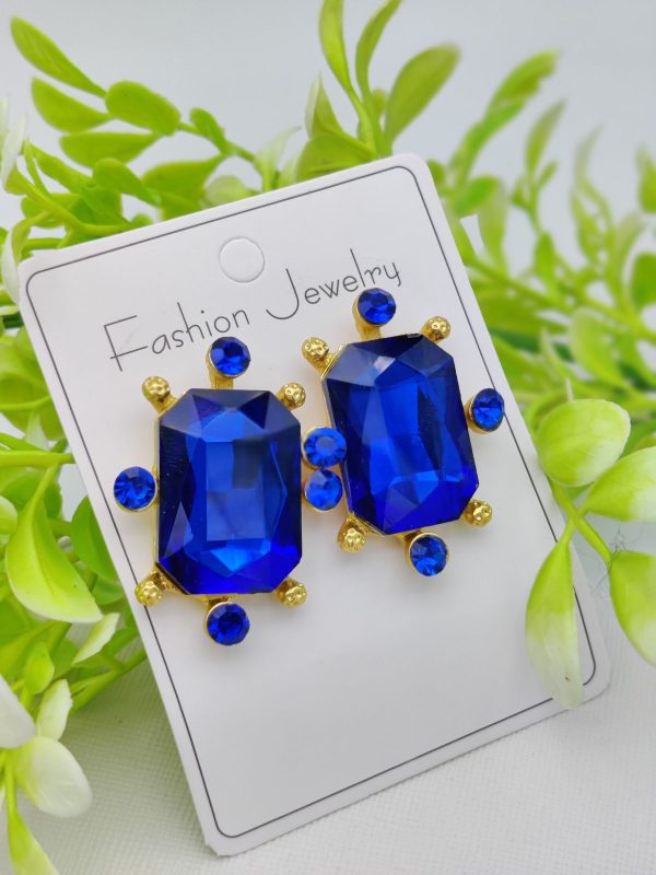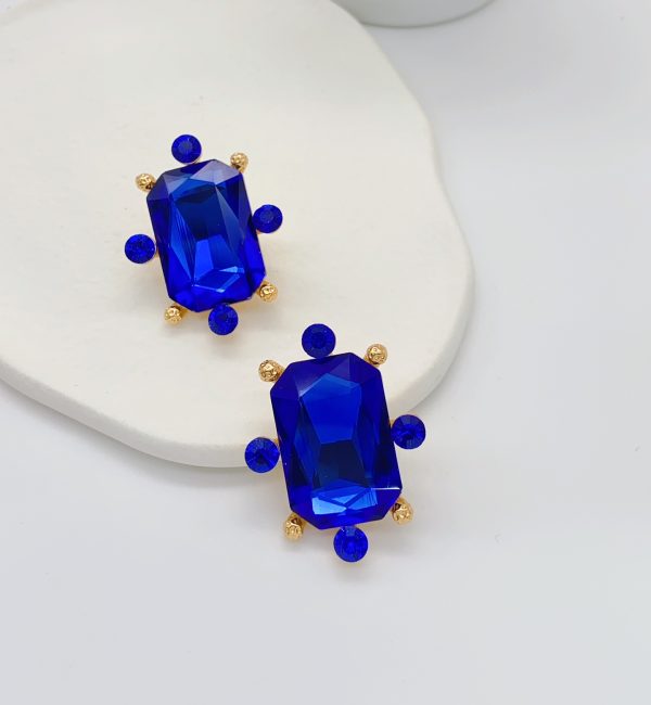 - Crafted with dazzling faceted royal blue stones and adorned with golden accents, these earrings are perfect for making a bold statement at any event.